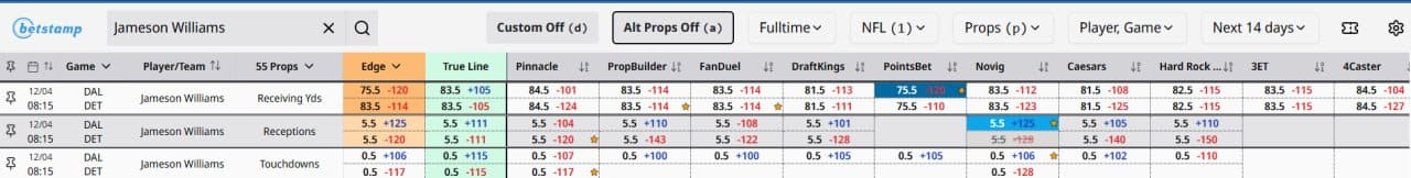 Jameson Williams’ entire prop board has seen one of the biggest shifts of the week, driven by Amon-Ra St. Brown being very unlikely to play and Detroit heading into the highest-total game on the slate at 54 points. FanDuel — one of the sharper books — opened Williams’ receiving yards at 79.5, and respected money quickly pushed it to 83.5. But it’s not just the yardage number that has moved. His receptions and touchdown markets are showing clear signs of soft books lagging behind.