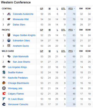 Things are a lot less convoluted in the West, only because the quality of the middle tier is so much worse. We also have a lot more “locks” in the West: Colorado, Minnesota, Dallas, Vegas, Edmonton. I’d also be pretty surprised at this point if the Mammoth or Kings don’t make it. It’s not that I’m in love with either of them, but they are a clear class above the teams they’re competing with, and that’s reflected in their current playoff odds (Mammoth -475,Kings -300). I’m not betting either at those numbers, but I think they’re both good enough teams to comfortably fend off the challenge of the teams they’re fighting with. If I’m right, that leaves just one more spot up for grabs, which will come down to the Ducks, Sharks, Kraken, Predators, or Jets. I am extremely out on the Kraken, I think the Jets have simply dug too big a hole to climb out of, and as much as I love how Nashville’s been playing, I think it realistically comes down to the Ducks and Sharks. It would be awesome to see Celebrini carry San Jose into the playoffs on his back, but selfishly I have a lot of pre-flop positions on the Ducks and I also think they’d be a much better watch in the first round. I love how they responded to losing nine straight, by winning seven in a row without both Troy Terry and Leo Carlsson. They’re getting both guys back soon, and Lukas Dostal has rediscovered his form. This is a really quality Ducks roster when fully healthy, and I think the talent gap between them and San Jose is just too much for the Sharks to overcome. I wouldn’t be running to bet it at-180, though. I don’t see a ton of value in the make/miss playoff markets in the West.